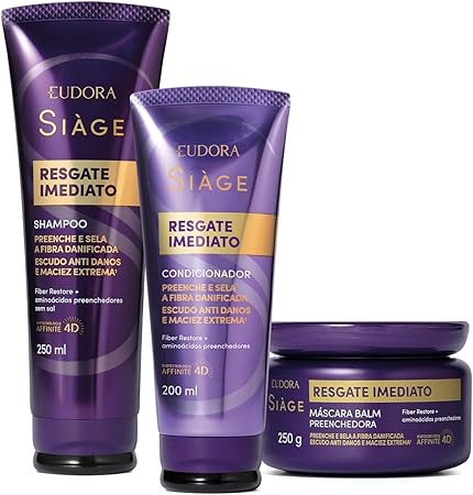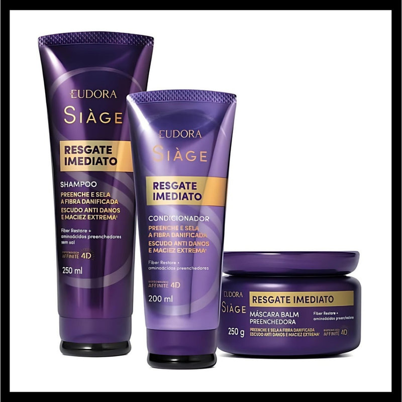 Ideal for your hair care routine , the Siàge Resgate Imediato Combo brings shampoo and conditioner for daily cleansing and a hair mask for weekly treatment. With exclusive Affinité 4D Biotechnology and formulas enriched with FIBER Restore®, Siàge Resgate Imediato brings the reconstruction stage of the hair schedule, immediately rescuing strands with persistent damage: